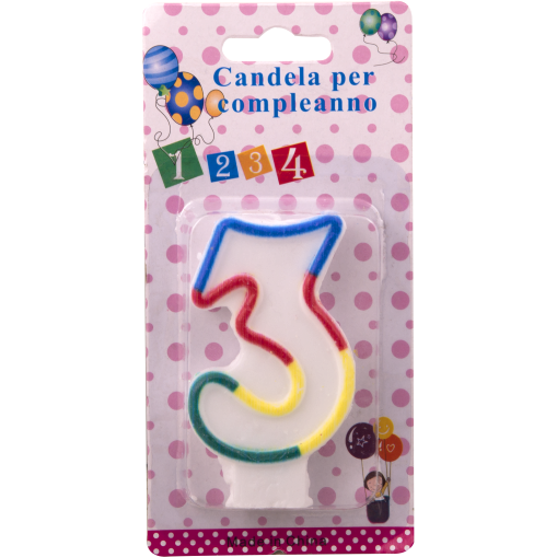 Lumanare aniversara, cifra 3, din parafina, inaltime 7 cm, multicolor, 1 bucata pe blister.