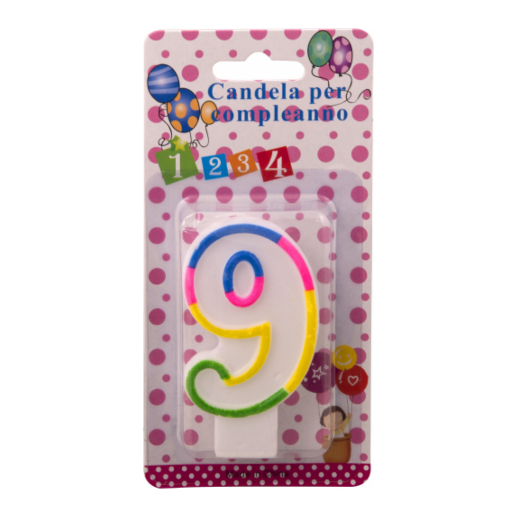 Lumanare aniversara, cifra 9, din parafina, inaltime 7 cm, multicolor, 1 bucata pe blister.