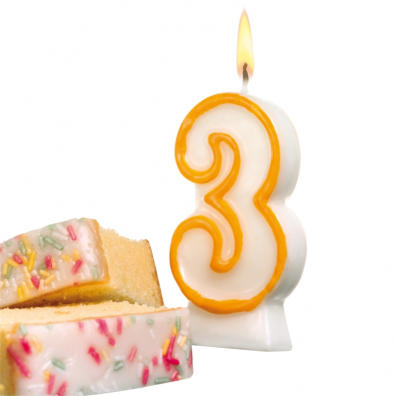 Lumanare aniversara, cifra 3, din ceara, inaltime 8,5 cm, 1 bucata pe blister.
