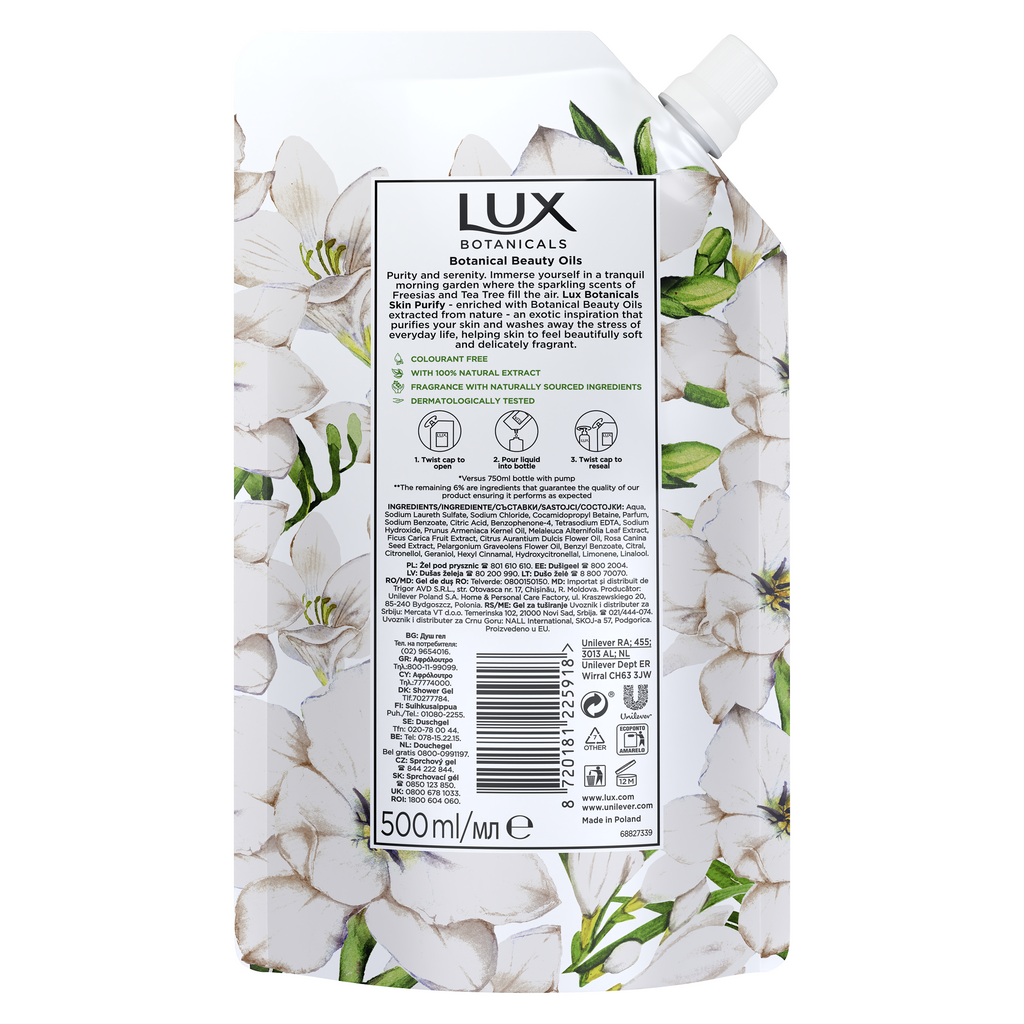 Puritate si serenitate. Lasa-te invaluita de un sentiment de liniste intr-o gradina plina de miresme efervescente de frezie exotica si arbore de ceai.€‹ Gelul de dus LUX Botanicals cu Frezie si ulei din Arbore de Ceai, imbogatit cu uleiuri botanice extrase din natura, este o inspiratie exotica ce iti purifica pielea si elimina stresul din viata de zi cu zi, ajutand pielea sa se simta catifelata si delicat parfumata.
