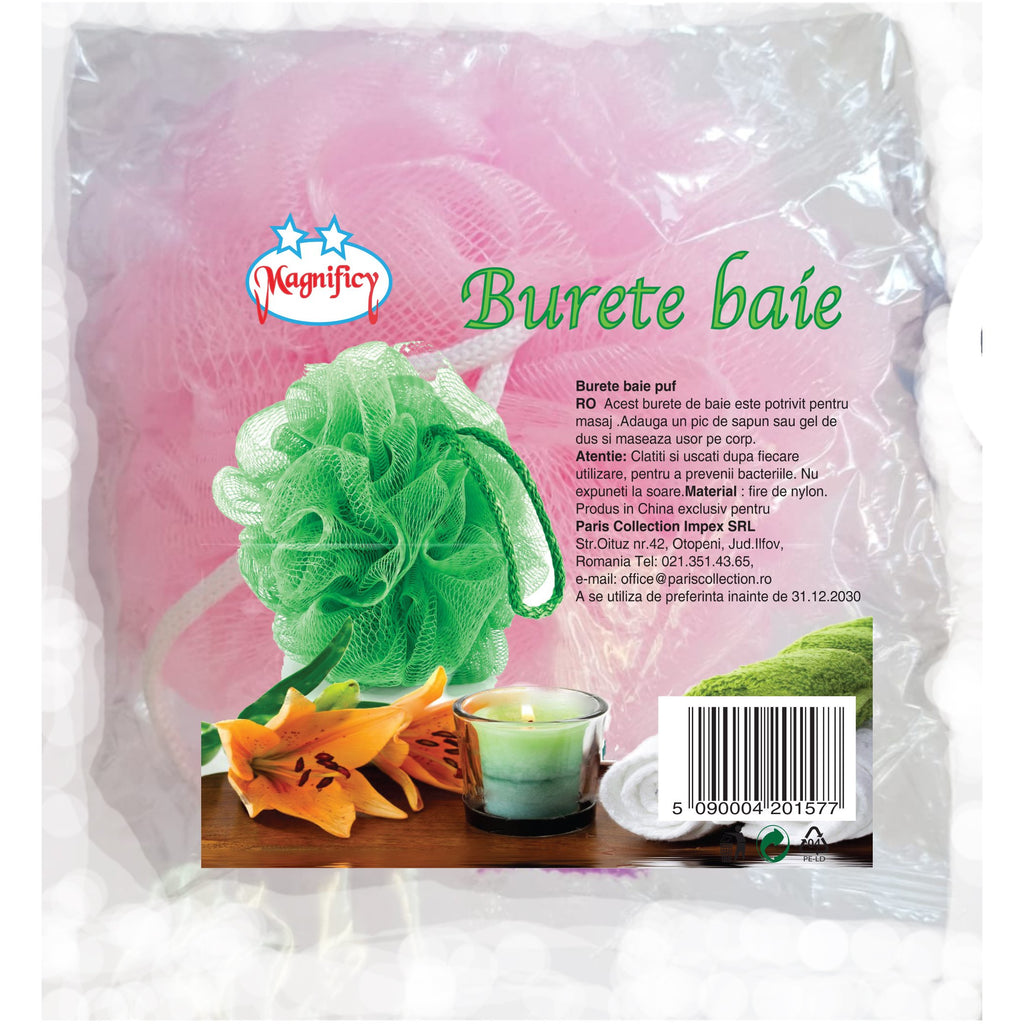 Burete baie puf potrivit pentru masaj. Adaugati un pic de sapun sau gel de dus si maseaza usor pe corp. Clatiti si uscati dupa fiecare utilizare pentru a preveni bacterile. Nu expuneti la soare.