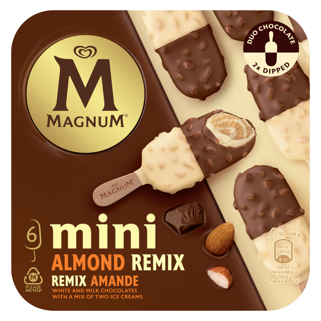 Magnum Mini Almond Remix inghetata cu aroma de migdale si vanilie cu ciocolata alba, 6 bucati, cutie 330ml