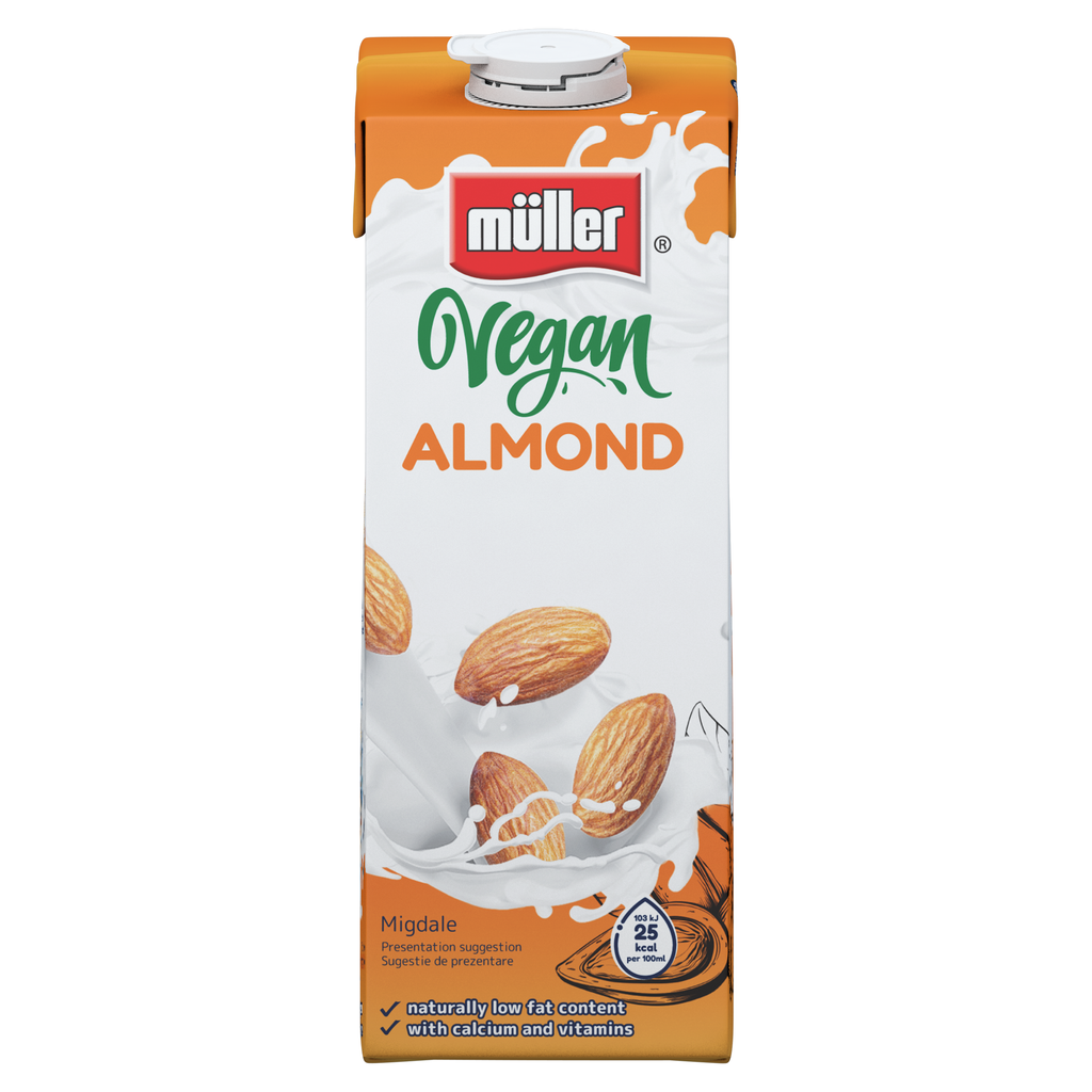 MULLER VEGAN MIGDALE 1L. Bautura vegana pe baza de migdale cu calciu si vitamine: in mod natural continut redus in grasimi, contine calciu si vitamine. in mod natural fara lactoza.