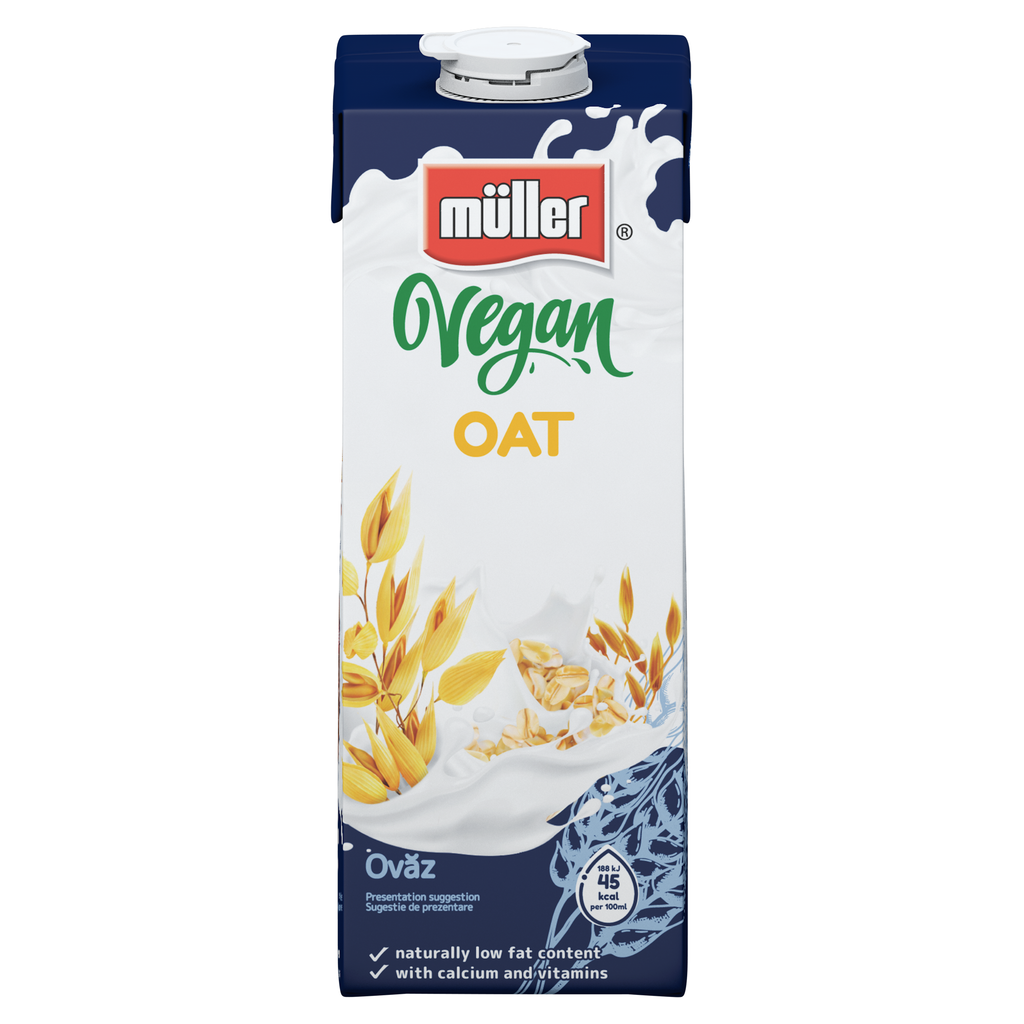 MULLER VEGAN OVAZ 1L. Bautura vegana pe baza de ovaz cu calciu si vitamine: in mod natural continut redus in grasimi, contine calciu si vitamine. in mod natural fara lactoza.