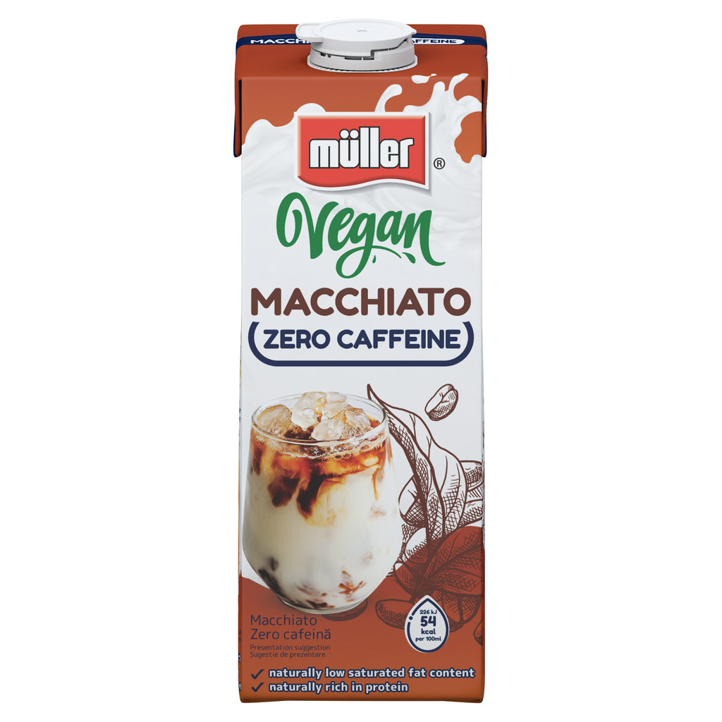 MULLER VEGAN MACCHIATO 1L. Bautura vegana pe baza de soia cu cereale: in mod natural continut redus de grasimi saturate, in mod natural bogat in proteine. in mod natural fara lactoza. ZERO CAFEINA.