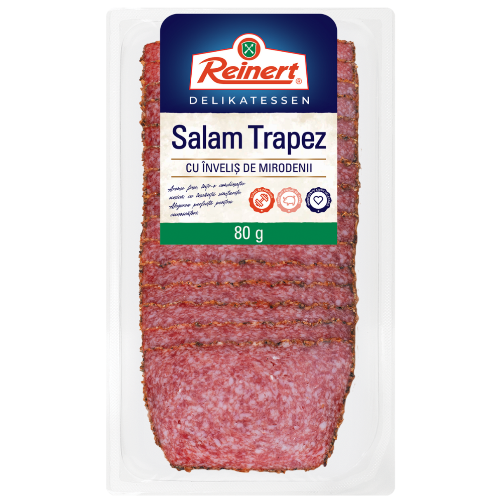 Aceeasi forma unica, trapezoidala, a feliilor de salam dar intr-o varianta noua, surprinzatoare, de gust oferita de invelisul generos de mirodenii. Este ideal pentru gustarile rapide, intalnirile nepregatite cu prietenii sau petreceri.