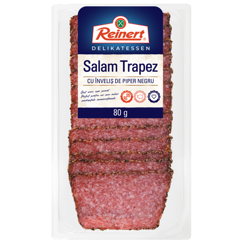 Invelisul de piper ce imbraca felia in forma unica, trapezoidala, a Salamului Trapez cu invelis de piper negru confera acestuia o aroma deosebita, usor picanta fiind ideal pentru cei carora le plac combinatiile usor neconformiste. 100g de produs se obtin din 105g carne de porc si 32g de slanina.