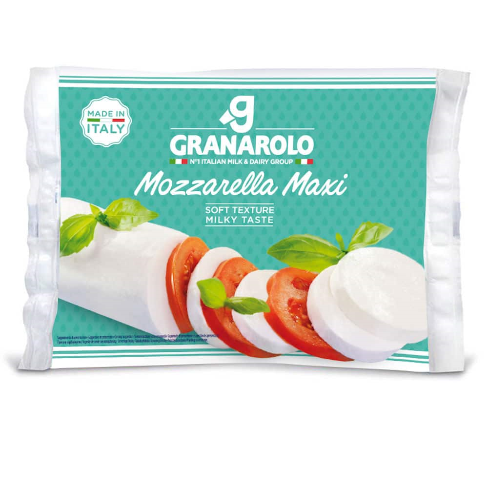 Mozzarella este un tip de branza cu pasta alba si textura elastica, originara din Italia. Este una dintre cele mai populare branzeturi utilizate in bucataria italiana si este recunoscuta in intreaga lume. Mozzarella maxi de la Granarolo este fabricata din lapte pasteurizat de vaca.